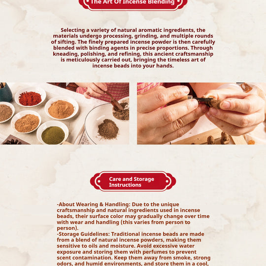 Our incense jewelry is crafted using natural ingredients and traditional Chinese herbs, carefully selected for their holistic benefits. These materials, including but are not limited to: agarwood, sandalwood, borneol, and other sacred botanicals, promote inner balance, relaxation, and mindfulness. Worn as a bracelet or necklace, the subtle fragrance lingers throughout the day, helping to calm the mind, enhance meditation, and support emotional well-being. Each piece is a fusion of ancient wisdom and modern elegance, bringing harmony to both body and spirit.